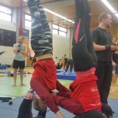 In verschiedenen Workshops lernten wir viele neue Übungen und Techniken. So bauten wir zum ersten mal einen 3-Mann-hoch, lernten viele neue Trio-Figuren, feilten an unseren Handständen und testen einen AirTrack aus. Ein weiterer Höhepunkt war die Gala-Show, bei der Akrobaten mit den verschiedensten Nummern (Partnerakrobatik, Tuchakrobatik, Jongleure, Trapez, Chinesischer Mast, etc.) auftraten, die wir aus den Publikumsrängen des Theater-Saals bestaunten.