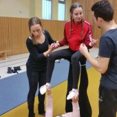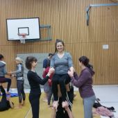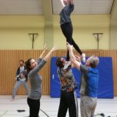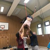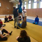 Der Workshop-Leiter Fons Bennink, ein Akrobatik-Trainer aus Holland mit über 30 Jahren Lehrerfahrung, gab uns sehr viele Tipps für unser Training mit auf den Weg. Zunächst wurde intensiv an den Basics wie Handstand geübt, bevor wir uns der Partnerakrobatik widmeten. So wurde z.B. Hand-to-Hand, Gegenhandstand, Stehen in den Händen, sowie einfache Ikarien (Wurfelemente) geübt. Dabei kam zum ersten mal auch unsere Longe zum Einsatz, die wir hoffentlich auch bald bei uns in Börrstadt in der Halle zum sichern von schwierigen Elementen nutzen können.